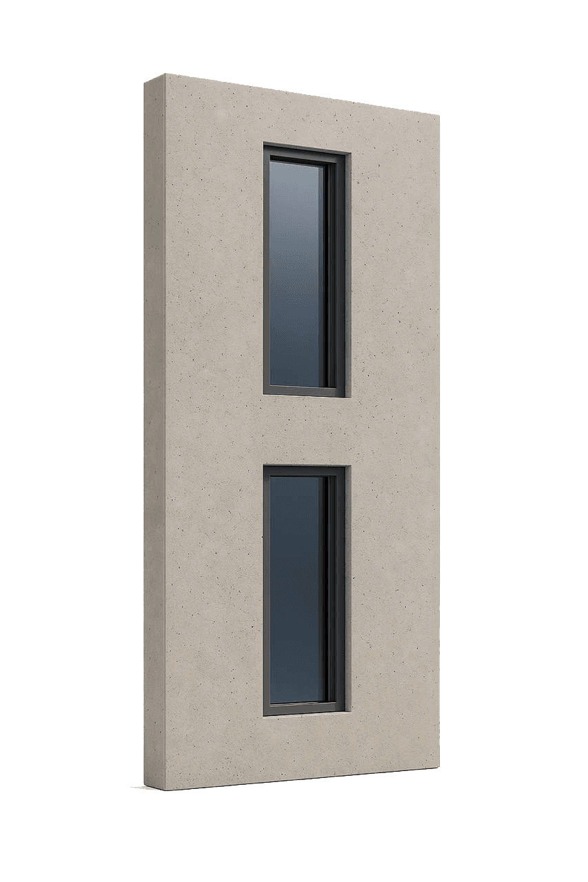 PanelCORE — is an assembled two-layer panel of UHPC with internal thermal-reinforced frame (technology ThermoBEAM]. The panel combines load-bearing strength, thermal and sound insulation, as well as precise modular geometry, allowing for reduction of concrete volume without loss of load-bearing capacity. PanelCORE is supplied from the factory ready for installation, with integrated insulation and window modules.